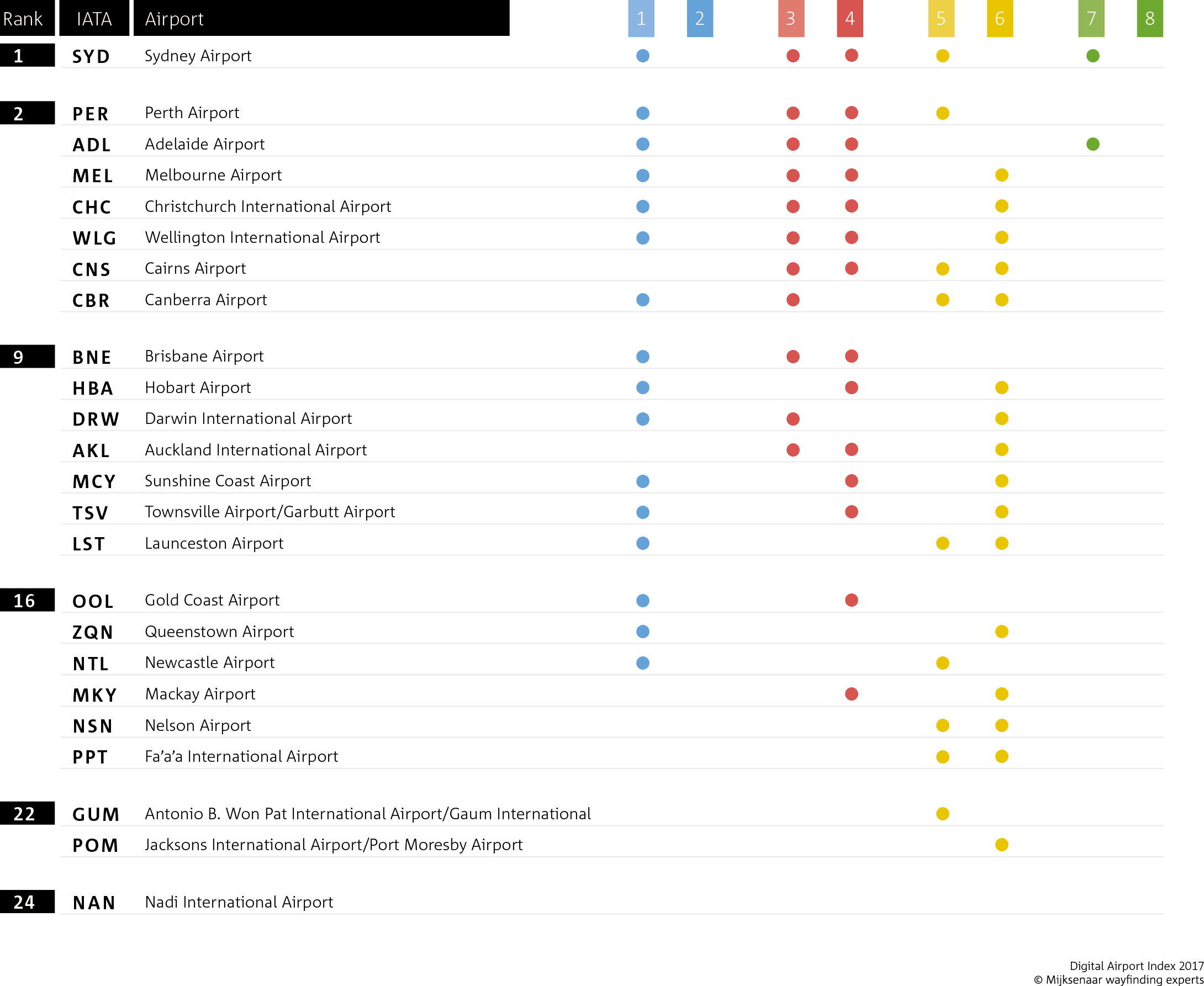 The comprehensive infographic below shows the results of the 2017 Oceania Digital Airport Index. Sydney Airport is the top ranking airport with 5 points. Second place is shared amongst 7 airports each scoring 4 points.